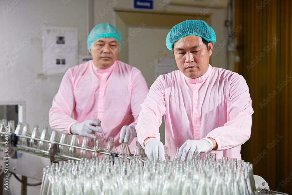 male factory workers checking glass bottles on conveyor in the beverage factory