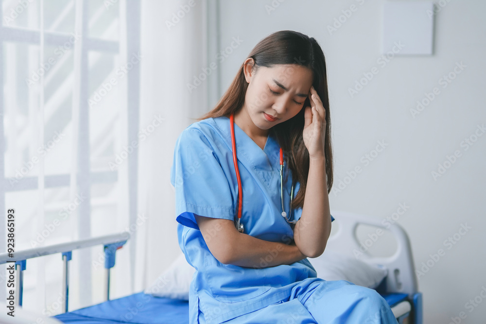 Young doctor in blue scrubs is sitting on a hospital bed with her hand on her head, experiencing a headache and stress