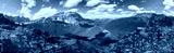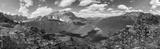 A panoramic view of a mountain range with a large rock on top