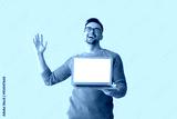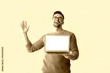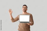 Happy young man with laptop on light background