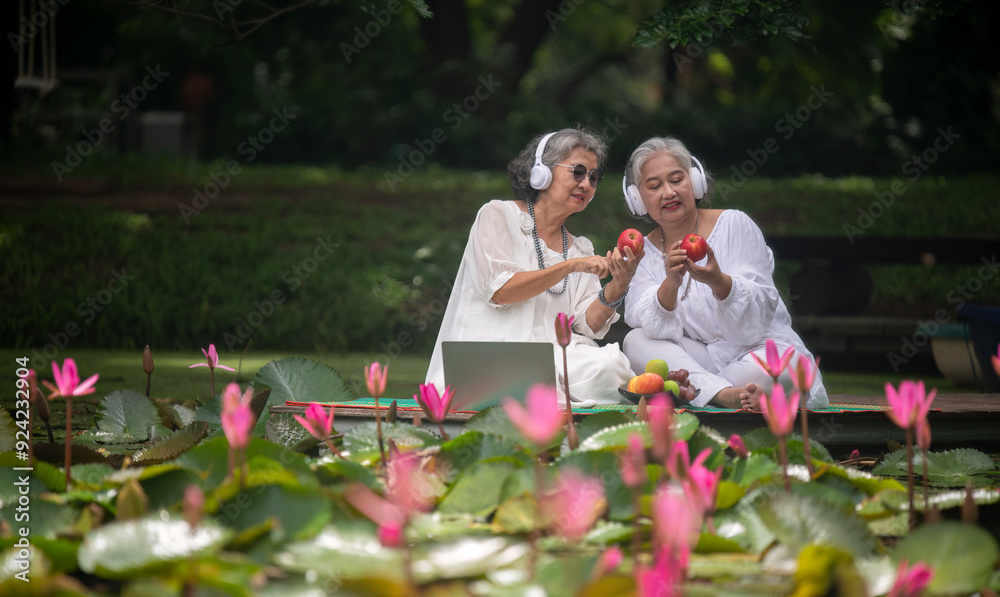two elderly women sitting by a pond surrounded by blooming lotus flowers. They are both wearing white tops and headphones, enjoying music while holding apples