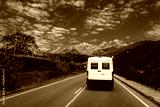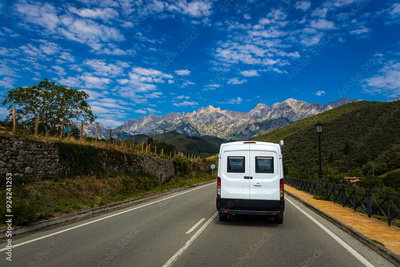 Camper van in the Picos de Europa, a mountain range extending for about 20 km, forming part of the Cantabrian Mountains in northern Spain
