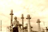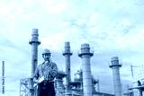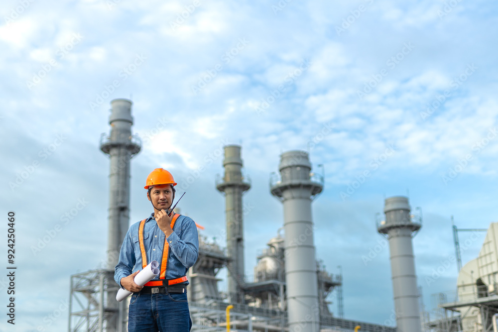 Man engineer talking with walkie-talkie working factory producing electricity oil. Construction manager oil refinery in petrochemical. improvement inspector Industrial worker working power plant.