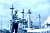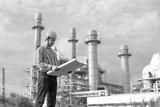 Asian worker power plant factory looking blueprint check construction plan power plant. Engineer wearing safety uniform helmet at energy petrochemical industry.