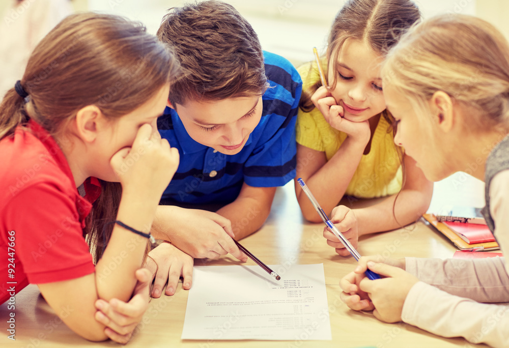 group of students talking and writing at school