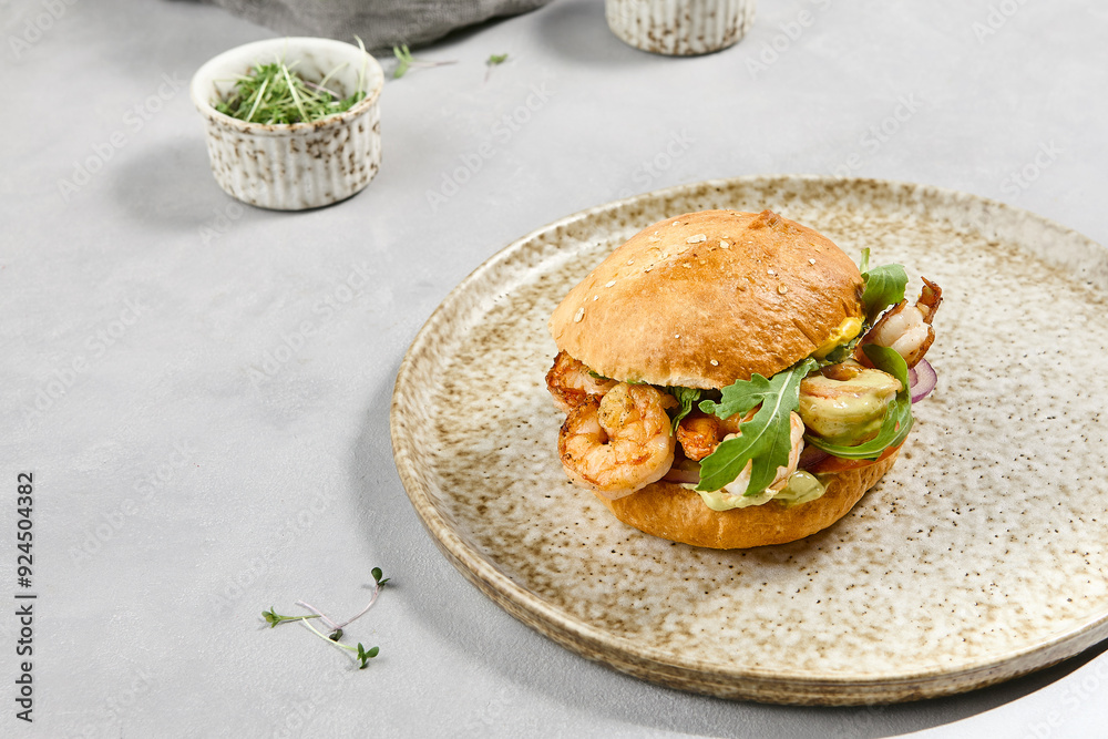 Gourmet Shrimp Burger with Guacamole on Artisan Bun