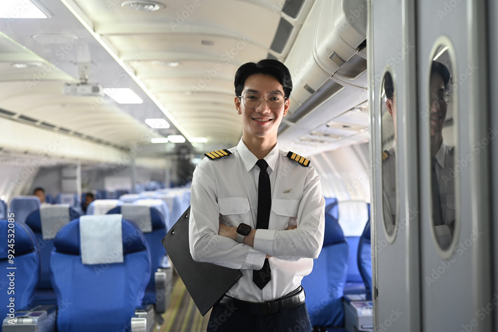 Portrait of smiling pilot standing with his arms crossed in the aisle of an airplane