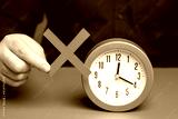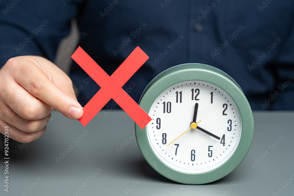 A man is holding a red no prohibition sign near clock. Prohibition of time change. Summer and winter time. Review laws, regulations