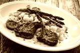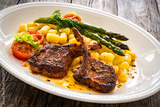 Lamb chops with bone, gnocchi and cooked green asparagus served on white plate on wooden table