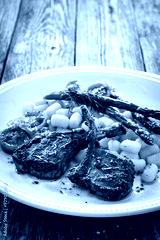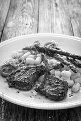 Lamb chops with bone, gnocchi and cooked green asparagus served on white plate on wooden table