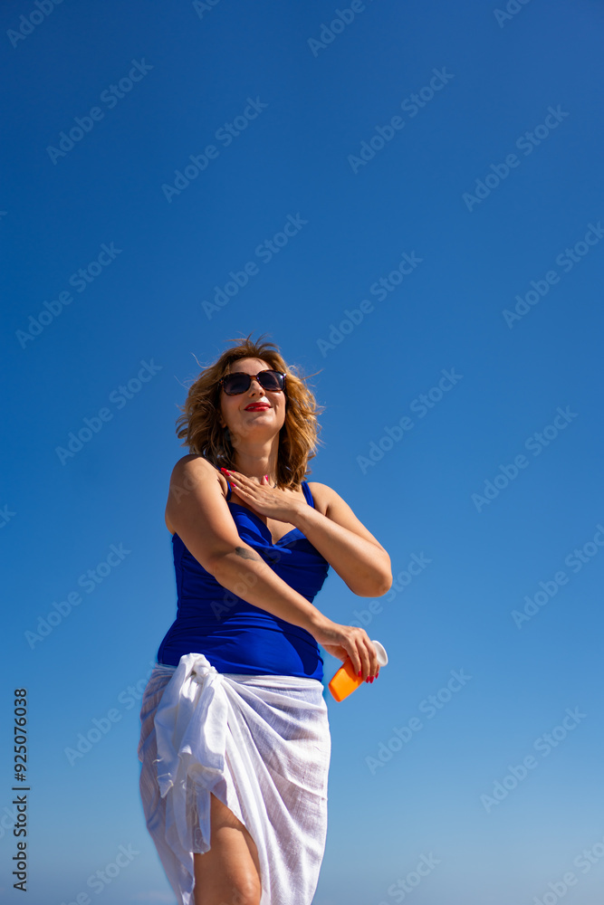 Sun protection. Beautiful young woman with long hair in blue swimsuit and white sarong and sunglasses applying sunscreen to her arms standing on white sandy beach on sunny day. Healthy lifestyle.