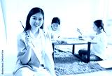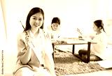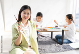Young woman or teacher holding a paintbrush with two children painting on table in the classroom
