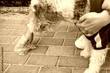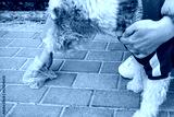 Picking up dog poop. Dog Wire Fox Terrier wearing red sports longsleeve sweater walking outside outdoor.
