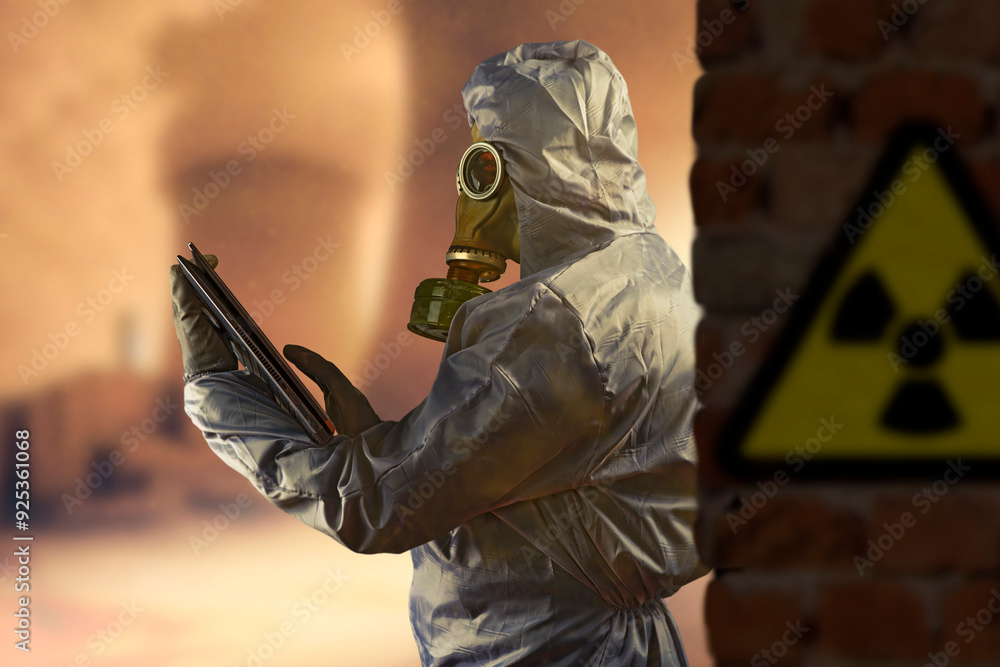 Man in a gas mask and protective suit typing analysis nuclear danger on tablet. Apocalypse, radiation, toxins, Nuclear Power Plant concept