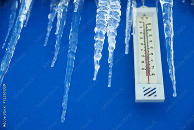 Long natural icicles on sky background and weather thermometer with fahrenheit and celsius measurement temperature. Forecast concept.