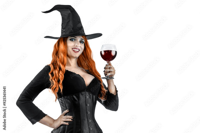 Halloween Witch drinking wine and having fun at the party. Female wizard fairy character. All Saints' Day. Fantasy gothic red-haired girl in carnival black dress