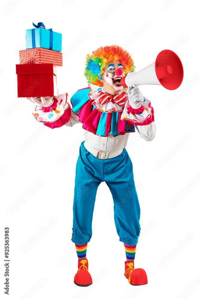 Funny clown with gifts shouting with loudspeaker. Entertainer Joker in colorful suit and wig. Trickster, jester, pantomime, mime, whiteface makeup. Professional actor at event, kids party, circus.