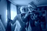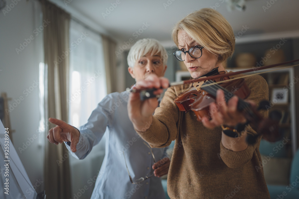 Private music teacher give violin lesson mature senior woman at home