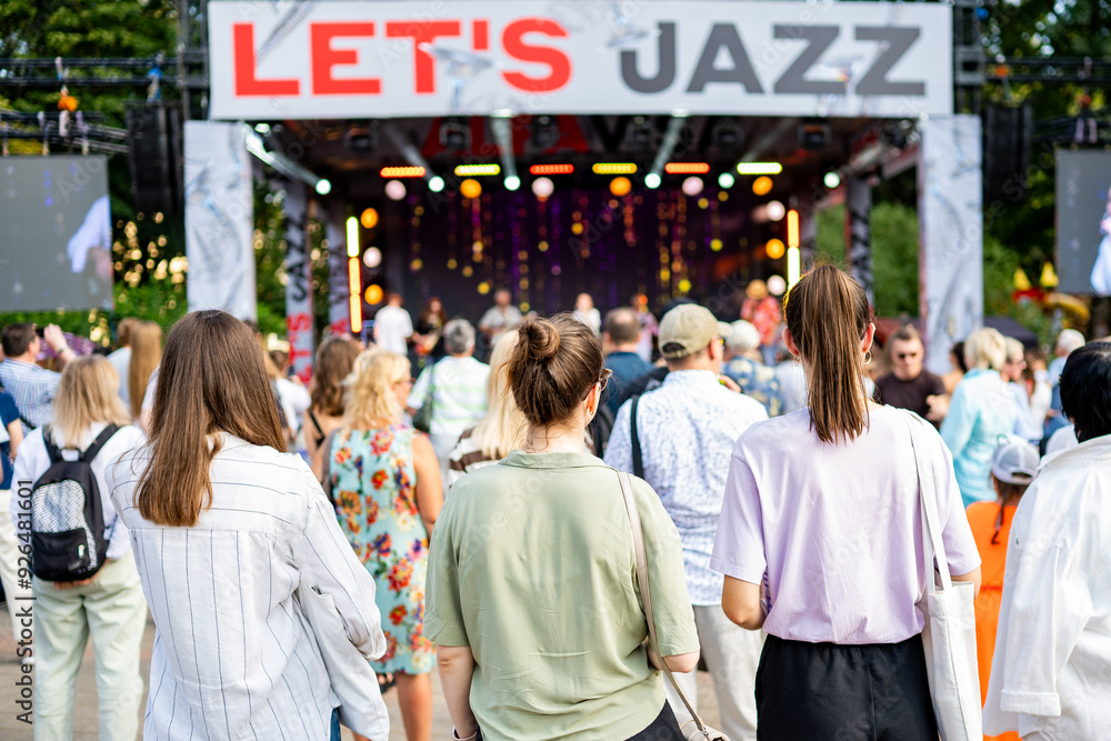 A crowd enjoys an outdoor jazz festival, watching a stage with a “LET’S JAZZ” banner. The image captures the lively atmosphere of a live music event, with people gathered to enjoy the performance.