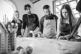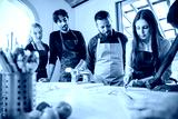 Cooking class, culinary experience of preparing ravioli, a typical Italian dish - Group of students attend the course practicing under the supervision of the chef