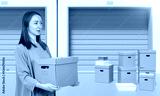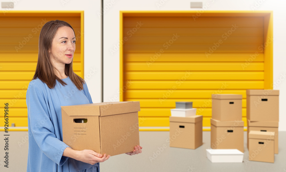 Woman with box near warehouse gate. Self storage unit behind girl. Lady rents personal warehouse. Closed storage units for long-term safekeeping. Woman near storerooms with orange gates