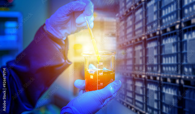 Oil quality analysis. Gasoline testing in laboratory. Hand with flask near storage barrels. Laboratory analysis oil for compliance with eco standards. Petroleum research to find alternative concept