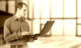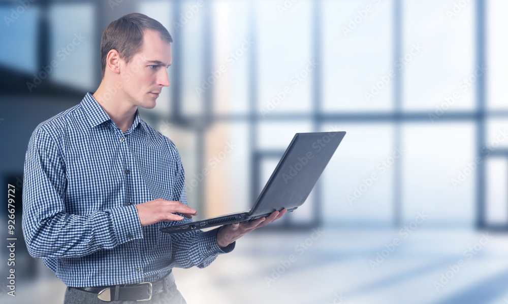 Business man with laptop. Guy is office worker. Man stands with computer in his hands. Manager in business center building. Businessman focused on work. Guy in checkered formal shirt
