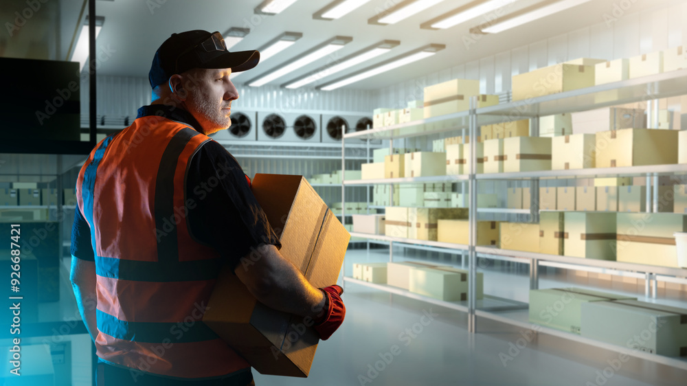 Man inside industrial refrigerator. Storekeeper with box. Freezer in supermarket warehouse. Man storekeeper at work. Warehouse refrigerator with shelves for products. Freezer in supermarket.