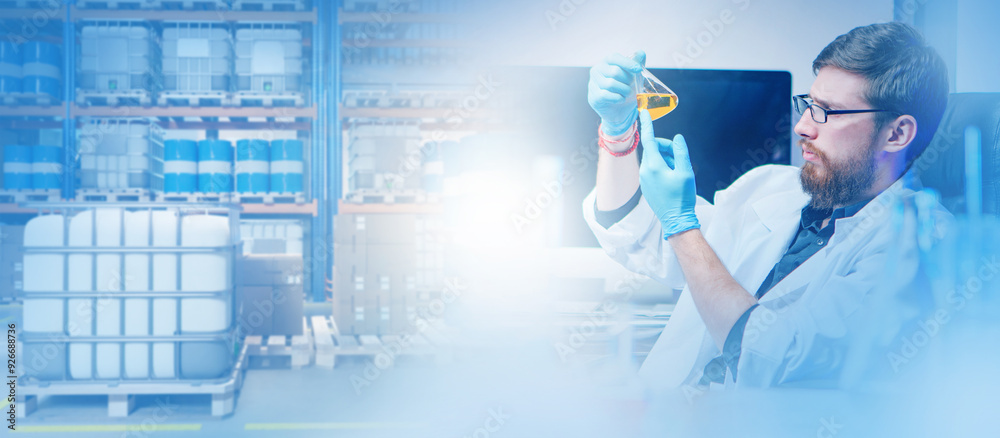 Laboratory assistant at chemical factory. Man with flask near fuel depot. Laboratory assistant with test tube in his hands. Man scientist analyzes composition of gasoline. Laboratory employee