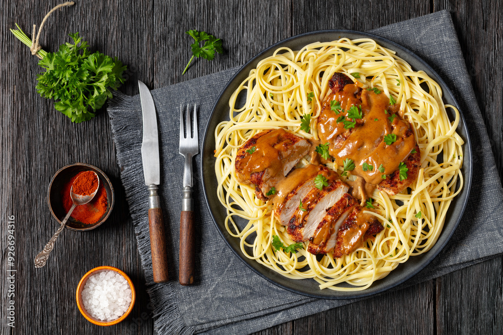 Chicken Lazone with sauce and linguine on plate