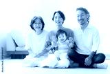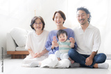 赤ちゃんと夫婦の4人家族(3世代、祖母、孫) 幸せなシーンの愛情のイメージのカメラ目線 左にコピースペースあり