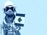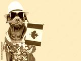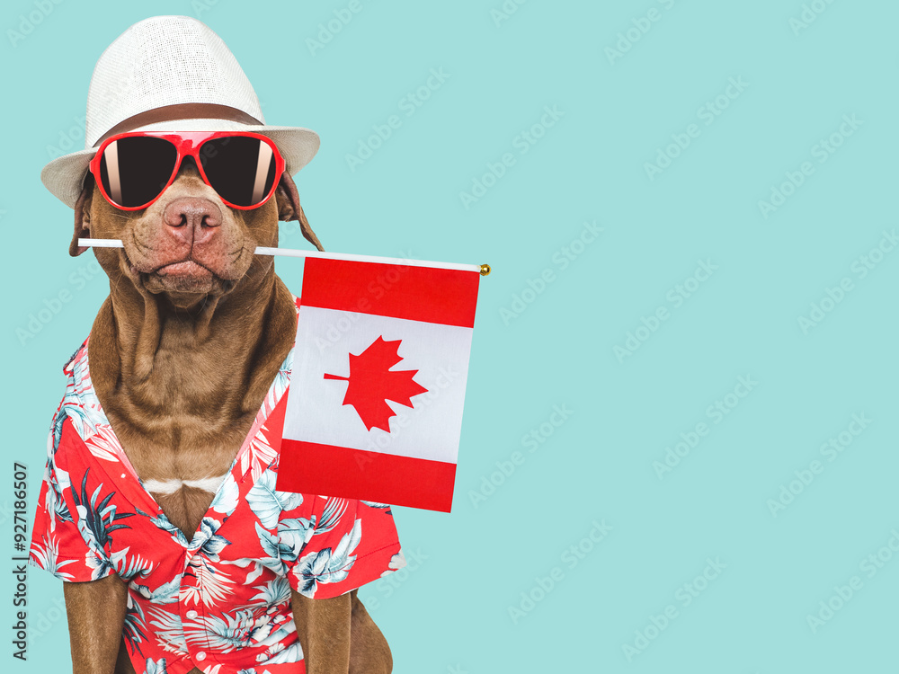 Charming brown dog, sunglasses, sun hat and Canadian Flag. Travel preparation and planning. Close-up, indoors. Studio shot, isolated background. Vacation, travel and tourism concept. Pets care