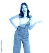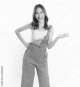 Cheerful beautiful Asian women show hands with open palms on forward isolated on white background.