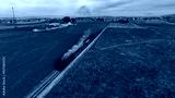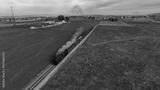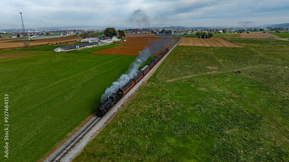 A steam locomotive chugs along the tracks, releasing smoke as it navigates through a scenic rural landscape filled with fields and farms.