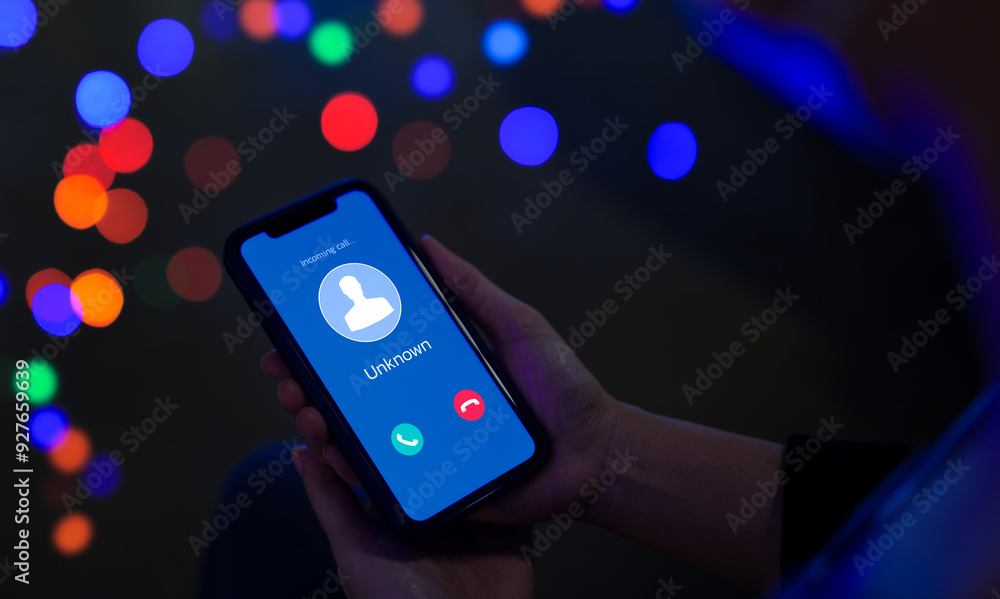 Woman holding mobile phone with incoming call from an unknown caller. scammer or stranger, Hoax person with fake identity, Prank caller, anonymous, Fraud or phishing concept, beware of unwanted calls,