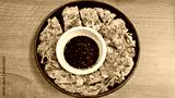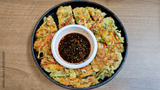 Close-up of Korean Haemul Pajeon Seafood Pancake with Soy Dipping Sauce on Black Plate on Wooden Table