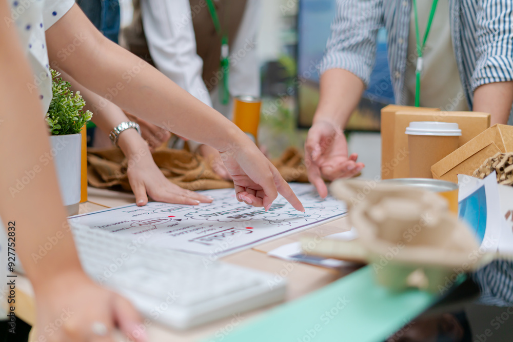 Young Asian business team discussion reusable product in office,start up eco-friendly business,environmental protection,sustainable business model,ESG strategy,team meeting,people work at home concept