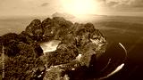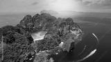Aerial top view sunset Maya Bay in island Phi Phi Leh, turquoise clear water in Krabi Thailand. Amazing travel photo by drone