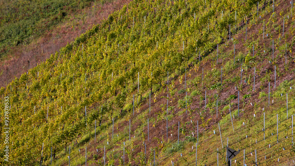 Panoramic view of Moselle winery landscape, Vineyards in golden autumn colors in Germany