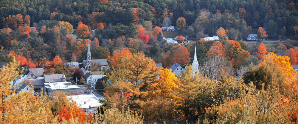 Panoramic aerial view of South Royalton town in Vermont during autumn time.