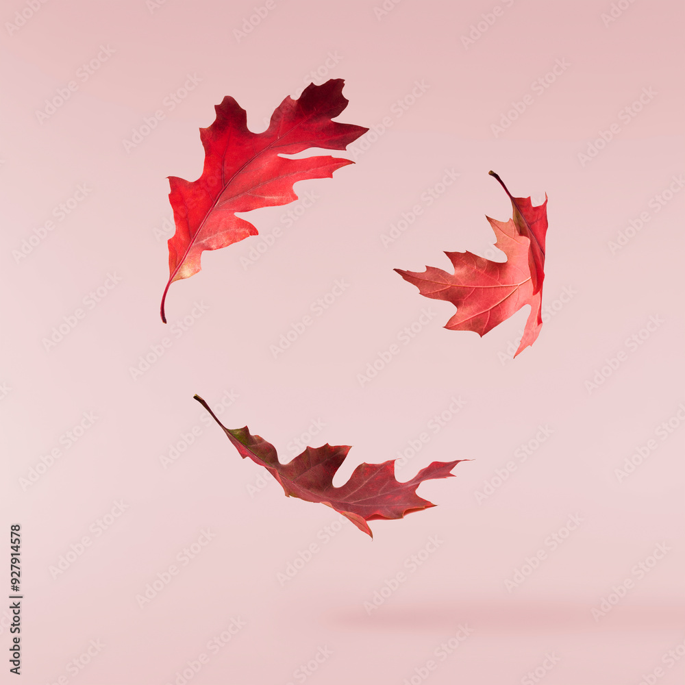 Beautiful bright colorful autumn leaves falling in the air isolated on pink background. Zero gravity or levitation autumn conception. High resolution image.