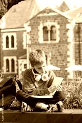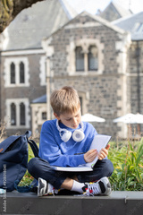 A young student enthusiastically engages in outdoor learning while using a notebook