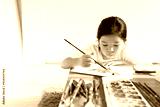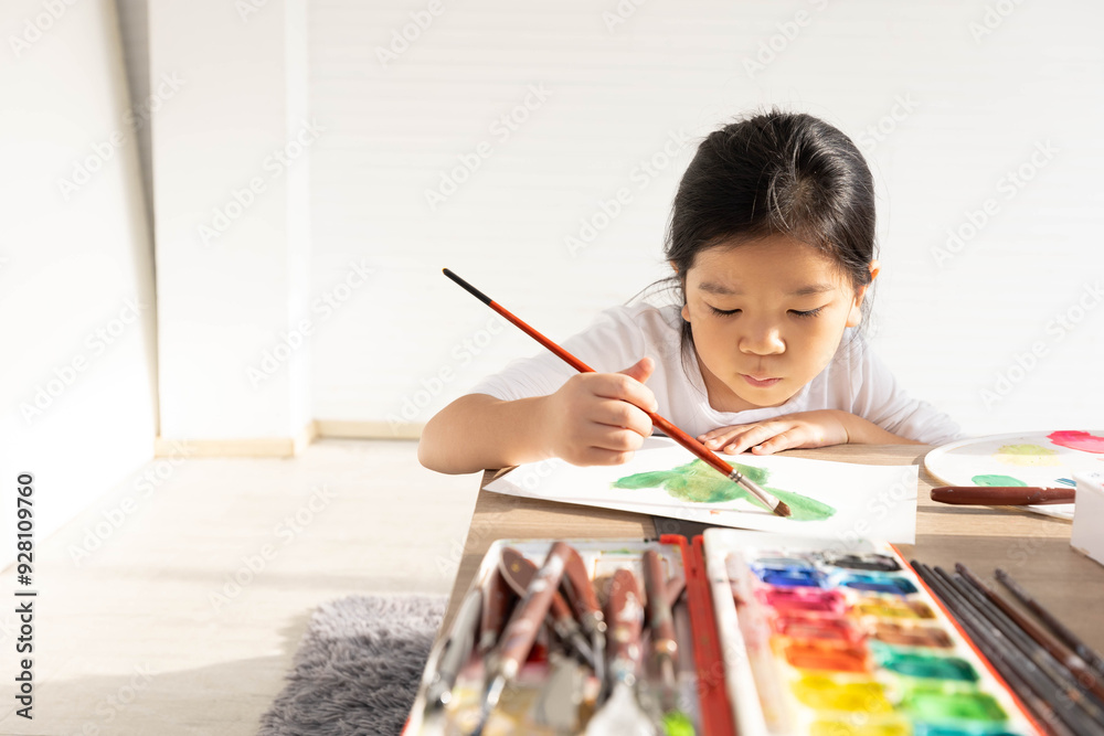 Child girl drawing and filled with colorful paints on paper in the classroom