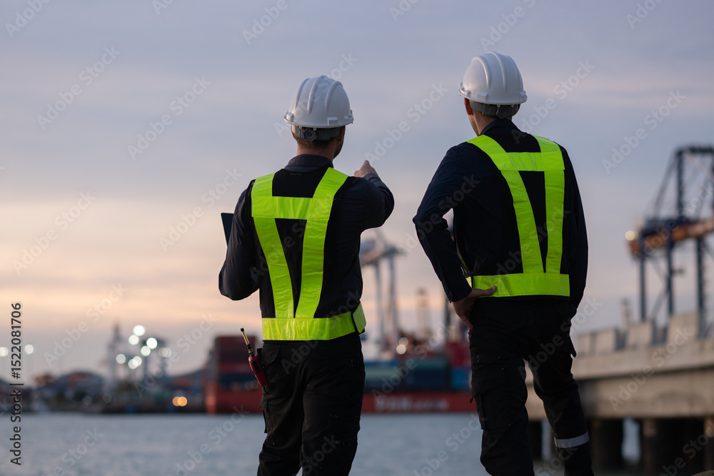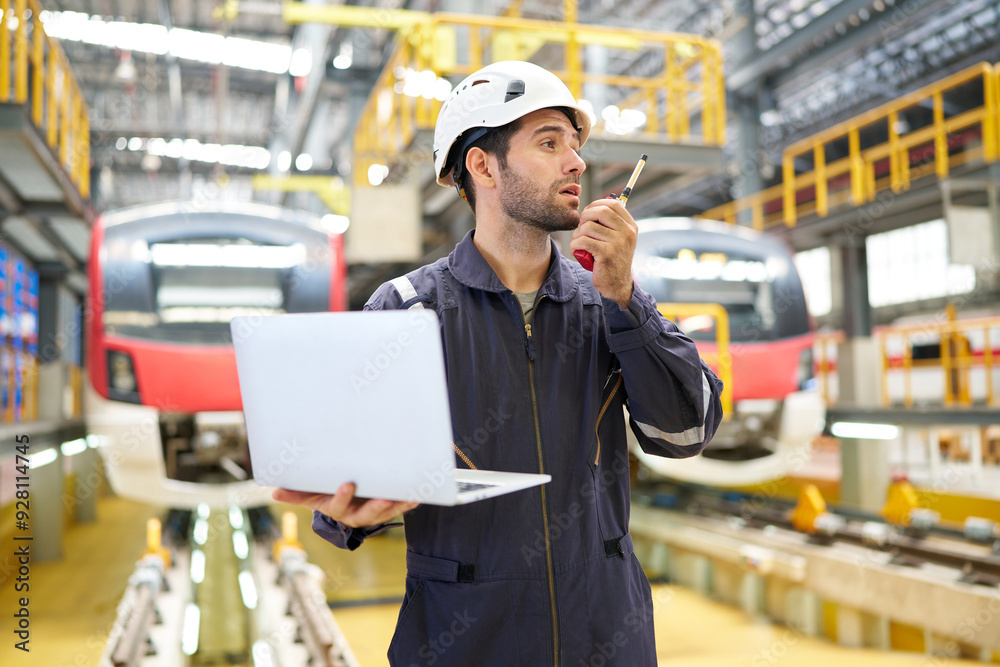 Engineer or worker working on laptop computer and talking on walkie talkie at construction train station
