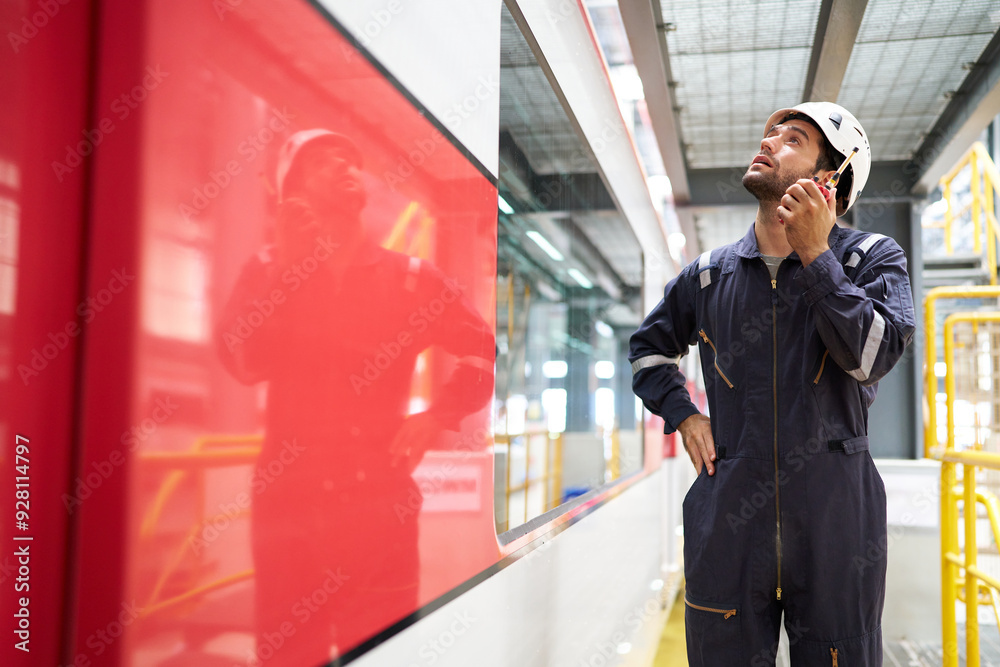 Technician or worker talking about work on walkie talkie and checking at construction train station