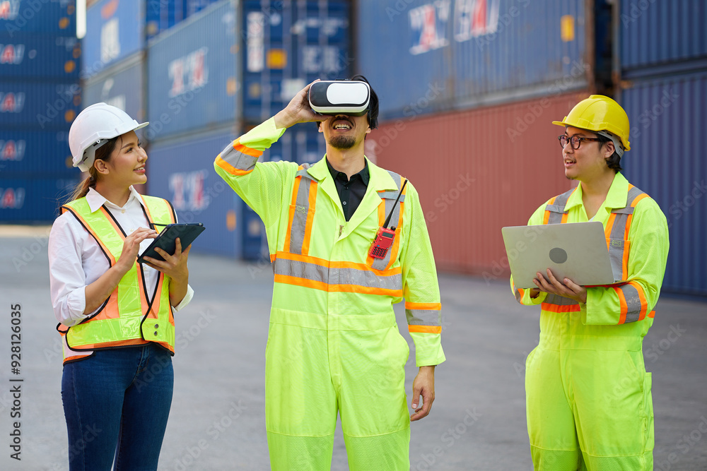 worker or engineer wearing virtual reality glasses(VR) in containers warehouse storage