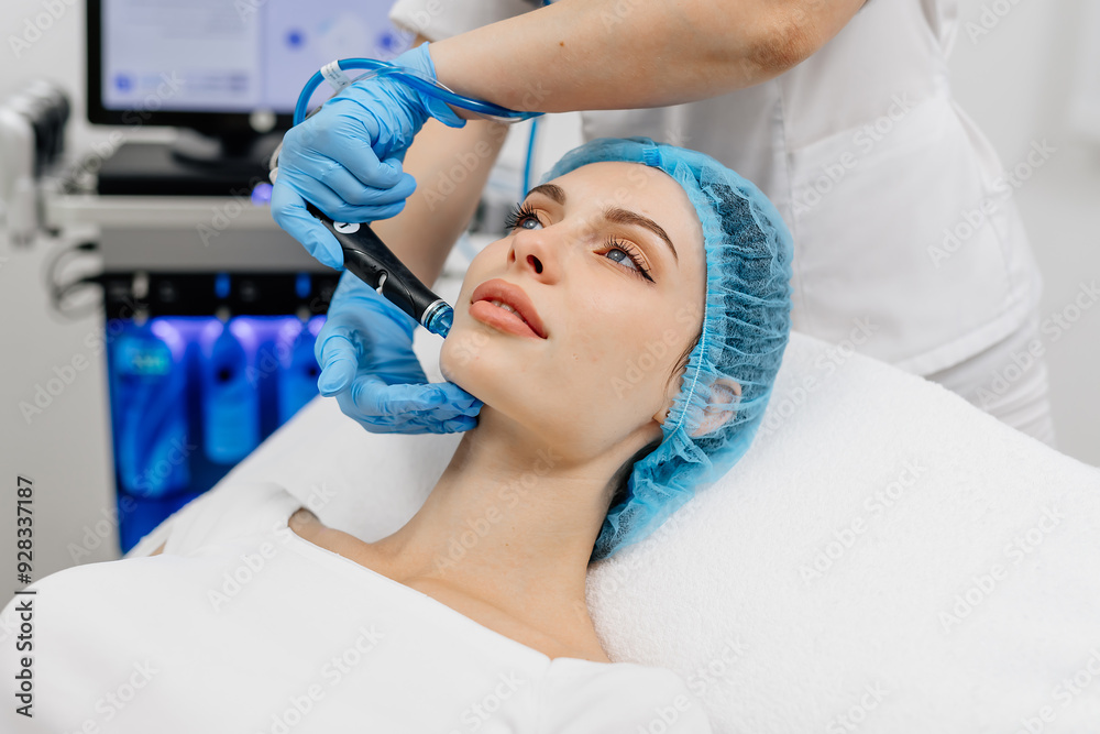 A mature woman undergoes a revitalizing facial procedure in a high-end beauty salon. The cosmetologist expertly uses a hydropeeling device to cleanse and rejuvenate her skin, showcasing advanced skinc