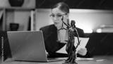 A young businesswoman intensely reviews documents and proposals late into the night at her office desk. Ideal for highlighting dedication, late-night work ethic, and professional focus.
