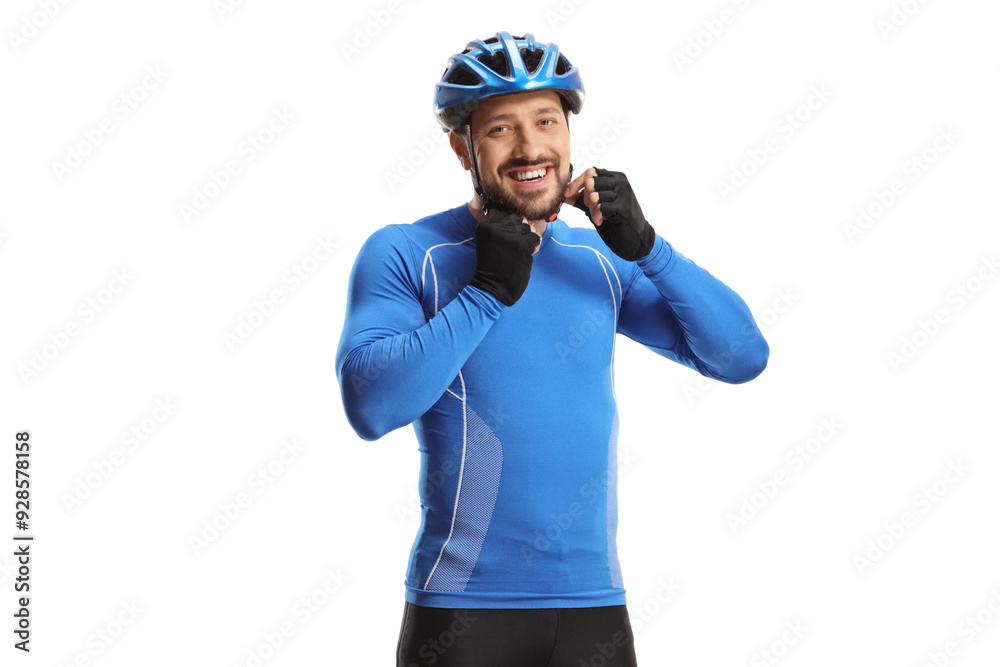 Male cyclist putting on a helmet and smiling