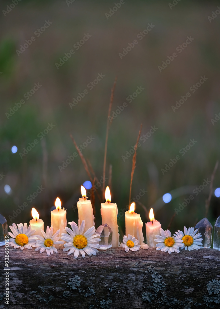 Chamomile flowers, burning candles, quartz crystals outdoor, abstract natural background. Witchcraft, Esoteric spiritual practice. magic Ritual for life balance, cleansing aura, soul and mind calming